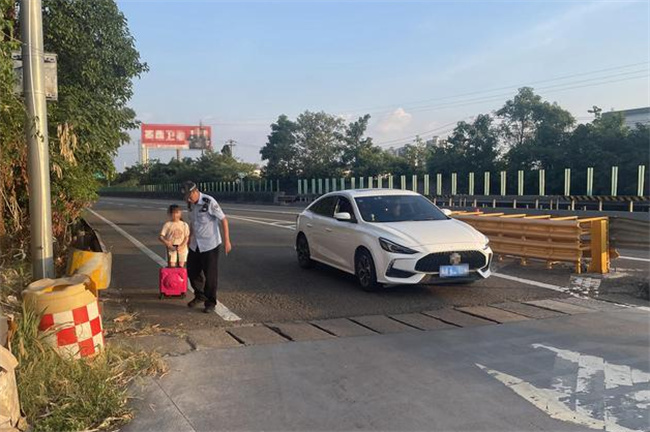 9月17日18时许,四川高速公安三分局二大队隆昌警组民警雷川和辅警甘德成正在巡逻时,监控中心传来警情:厦蓉高速隆昌停车区附近路段有一名小女孩独自拉着行李箱在路肩上行走。当天正值中秋节,监控录像显示,高速公路上车流量较大,时不时有车辆从小女孩身边驶过,十分危险。