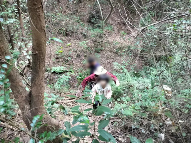 10月10日上午10时许,当搜救人员搜寻至一处偏僻山坳时,“大家听,那个方向是不是有声音?”众人驻足屏息倾听,果然听到微弱的回应声。所有人顿时精神大振,加快脚步往山坳深处寻去,回应声逐渐清晰。