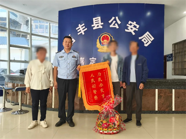10月12日上午,孩子家属将一面印有“为民办实事,人民好警察”的锦旗送至嘉定派出所民警手中,对民警帮助其找回走失小孩表示感谢。